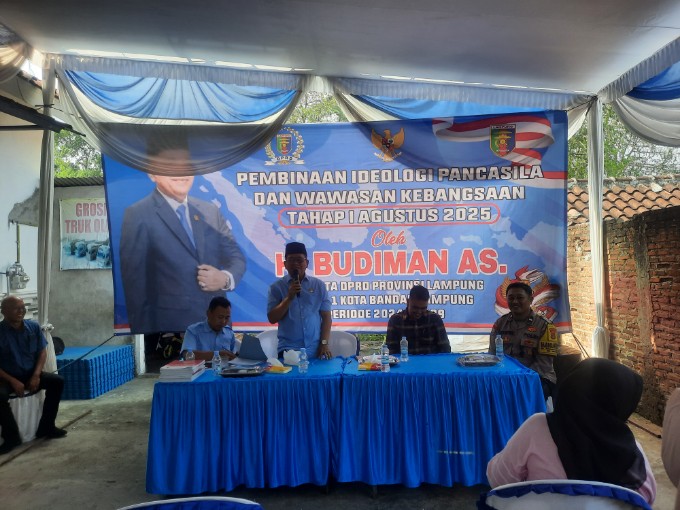 Bandarlampung (LW): Dalam upaya memperkuat fondasi ideologis bangsa dan menanamkan kembali nilai-nilai kebangsaan di tengah masyarakat, Anggota DPRD Provinsi Lampung dari Daerah Pemilihan (Dapil) Bandarlampung, Budiman AS, menggelar kegiatan Sosialisasi Pembinaan Ideologi Pancasila dan Wawasan Kebangsaan di Kelurahan Penengahan Raya, Kecamatan Kedaton, Kota Bandarlampung, pada Sabtu (9/8).