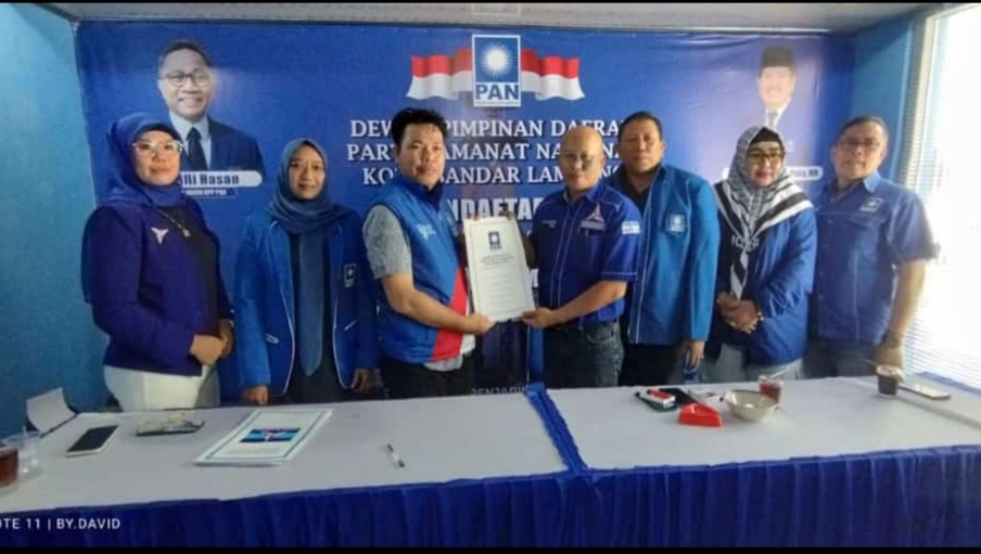 Bandarlampung (LW): Wasekjen BPP HIPMI Sekaligus Anggota DPRD Kota Bandarlampung Fraksi Partai Demokrat Rezki Wirmandi S.H mengambil Formulir Pendaftaran sebagai Calon Wakil Walikota di penjaringan Partai Amanat Nasional (PAN) Bandarlampung, Kamis (16/5) siang.