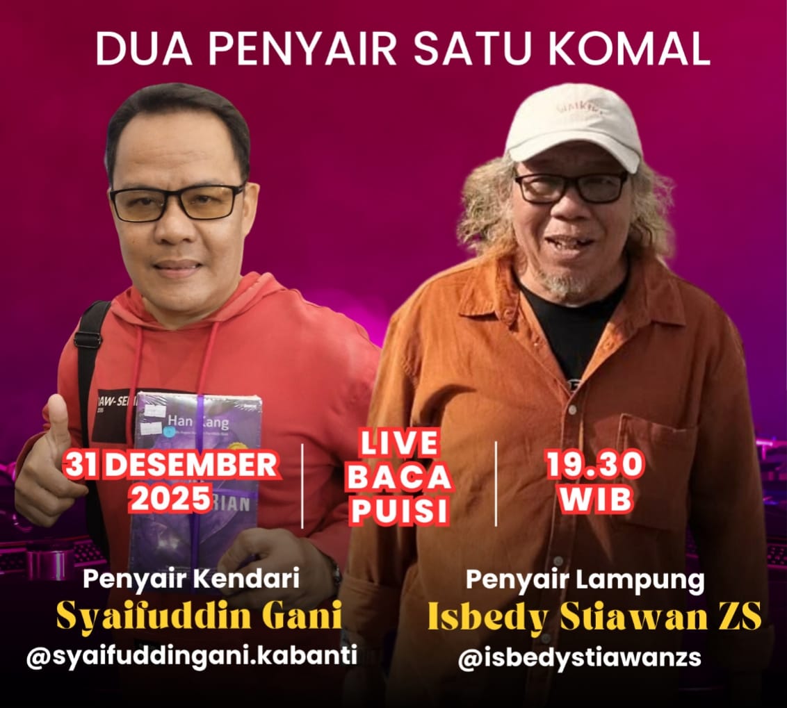 Bandarlampung (LW): Merayakan pergantian tahun baru, malam nanti dimulai pukul 19.30, dua penyair Indonesia tampil dalam Tiktok Talk Baca Puisi. Keduanya, Syaifuddin Gani dari Sulawesi Tenggara dan Isbedy Stiawan ZS asal Lampung. Acara dihelat Pustaka Kabanti dan Lamban Sastra.