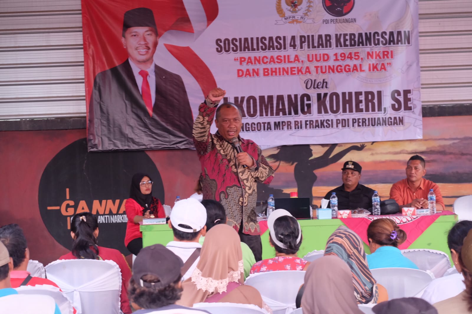 Lampung Tengah (LW): Dalam rangka mendukung program Majelis Permusyawaratan Rakyat (MPR) Republik Indonesia (RI), Anggota DPR RI I Komang Koheri, S.E menggelar sosialisasi 4 Pilar Kebangsaan di Aula KSP Tri Dharma Artha, Senin (24/6).