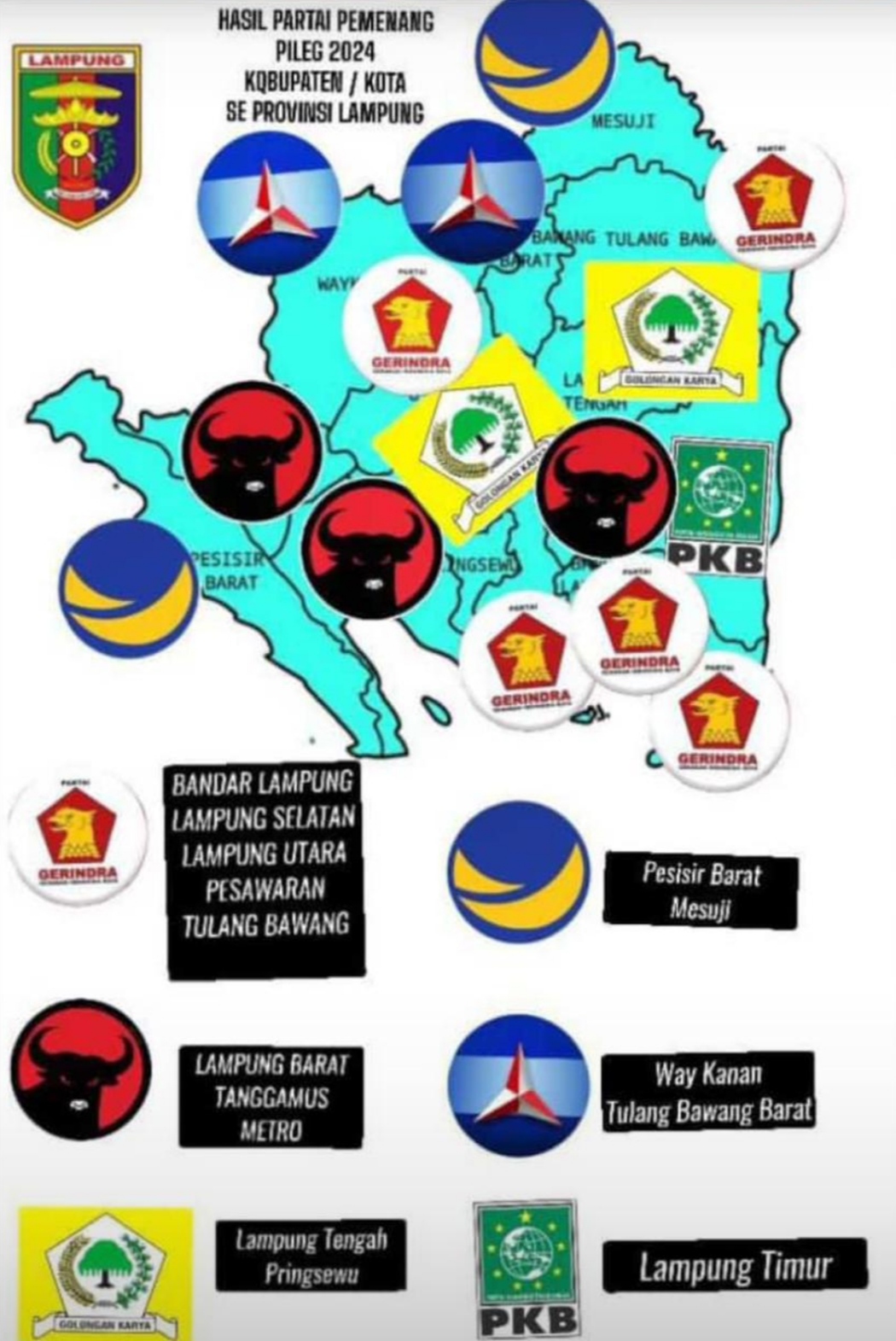 Hasilnya, Partai Gerindra paling sukses dengan menguasai lima dari 15 kabupaten/kota atau sepertiga Lampung. Lima kabupaten/ kota tersebut yakni Kota Bandarlampung, Lampung Selatan, Lampung Utara, Pesawaran dan Tulangbawang.