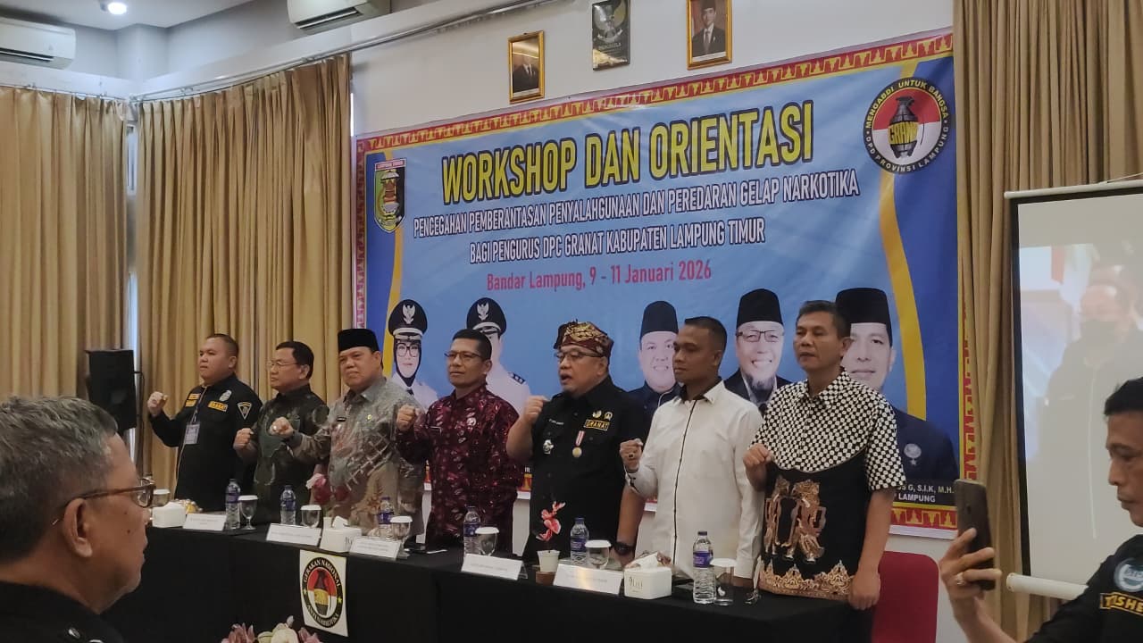 Diketahui, kegiatan Workshop dan Orientasi Penggiat Anti Narkoba Multistakeholders Kampung Bersinar (Bersih Narkoba) Kabupaten Lampung Timur, dilaksanakan bersama oleh DPD GRANAT Provinsi Lampung, Badan Narkotika Nasional (BNN) Provinsi Lampung, dan Pemda Kabupaten Lampung Timur, diikuti oleh 60 (enam puluh) orang peserta, terdiri dari Pengurus DPC GRANAT Kabupaten Lampung Timur, Unsur ASN, Tokoh Agama, dan Tokoh Masyarakat, dilaksanakan selama 3 (tiga) hari mulai 09-11 Januari 2026, di Hotel Alodia Bandar Lampung.