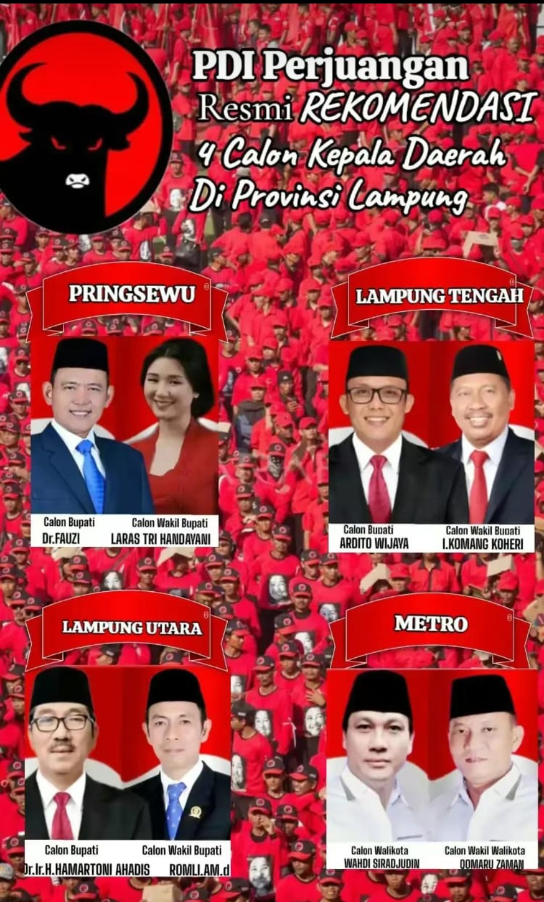 Dari 60 nama bakal calon kepala daerah yang diusung PDIP, empat diantaranya berasal dari Lampung yakni Lampung Tengah, Lampung Utara, Metro, dan Pringsewu yang notabenenya merupakan petahana sebelumnya dan juga kader internal PDIP.