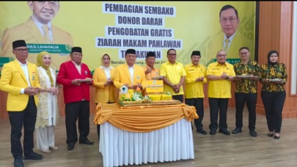Bandarlampung (LW): Dewan Pimpinan Daerah (DPD) Partai Golkar Provinsi Lampung menandai HUT ke-61 dengan rangkaian agenda bernapas penghormatan dan sosial di Graha Karya Utama Golkar Lampung, Senin (20/10). Mulai dari pembagian sembako, donor darah, pengobatan gratis, ziarah ke makam pahlawan hingga tasyakuran.