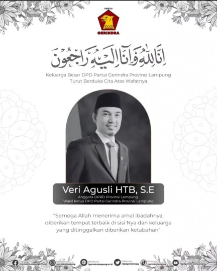 Bandarlampung (LW): Kabar duka menyelimuti lembaga legislatif Provinsi Lampung. Anggota DPRD Provinsi Lampung dari Fraksi Partai Gerindra, Veri Agusli HTB, meninggal dunia di Rumah Sakit Cipto Mangunkusumo (RSCM), Jakarta, pada Selasa (10/3).