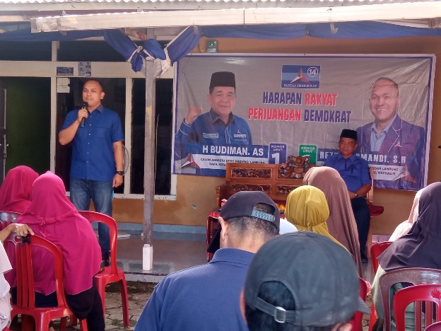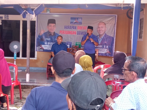 Bandarlampung (LW): Anggota DPRD Kota Bandarlampung Rezki Wirmandi bersama Ketua DPC Partai Demokrat Bandarlampung Provinsi Lampung yang juga Ketua DPC Partai Demokrat Bandarlampung Budiman AS menggelar silaturahmi sekaligus kampanye tatap muka dengan ratusan warga Gunung Sulah, Sabtu (20/1).