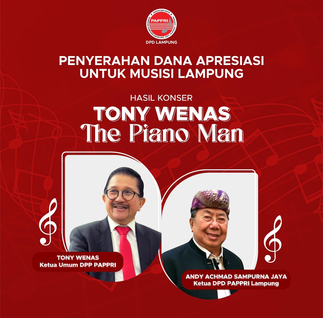 “Sebagian keuntungan dari Konser The Piano Man disumbangkan sebagai apresiasi dari PAPPRI kepada seniman musik Indonesia yang berasal dari DPD-DPD PAPPRI di seluruh Indonesia, termasuk DPD PAPPRI Lampung, sesuai komitmen DPP PAPPRI,” paparnya.