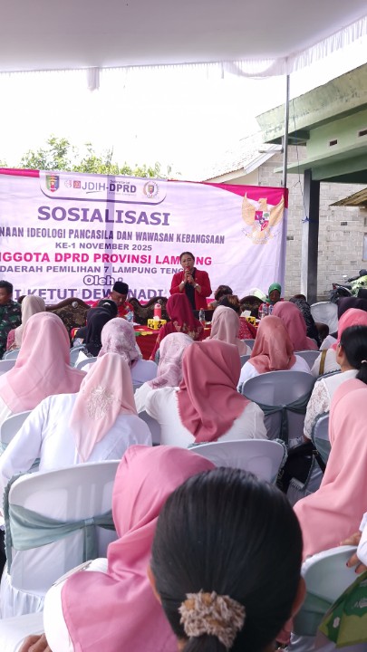 Lampung Tengah (LW): Anggota DPRD Provinsi Lampung Dapil Lampung Tengah, Ni Ketut Dewi Nadi, menggelar kegiatan Sosialisasi Pembinaan Ideologi Pancasila dan Wawasan Kebangsaan di Kampung Sri Kencono, Kecamatan Bumi Nabung, (9/11). Kegiatan ini menjadi ruang penguatan karakter kebangsaan sekaligus mempertegas pentingnya nilai-nilai Pancasila dalam dinamika sosial masyarakat.