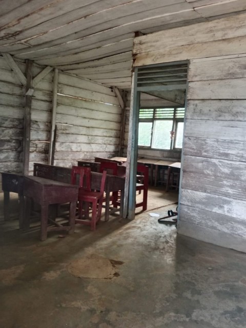 Sekolah yang seharusnya menjadi tempat menimba ilmu itu justru terlihat seperti bangunan tak layak huni. Dindingnya hanya terbuat dari papan, jendela tak ada, atap berlubang, lantai semen kotor, dan fasilitas belajar seperti kursi dan meja sangat terbatas.