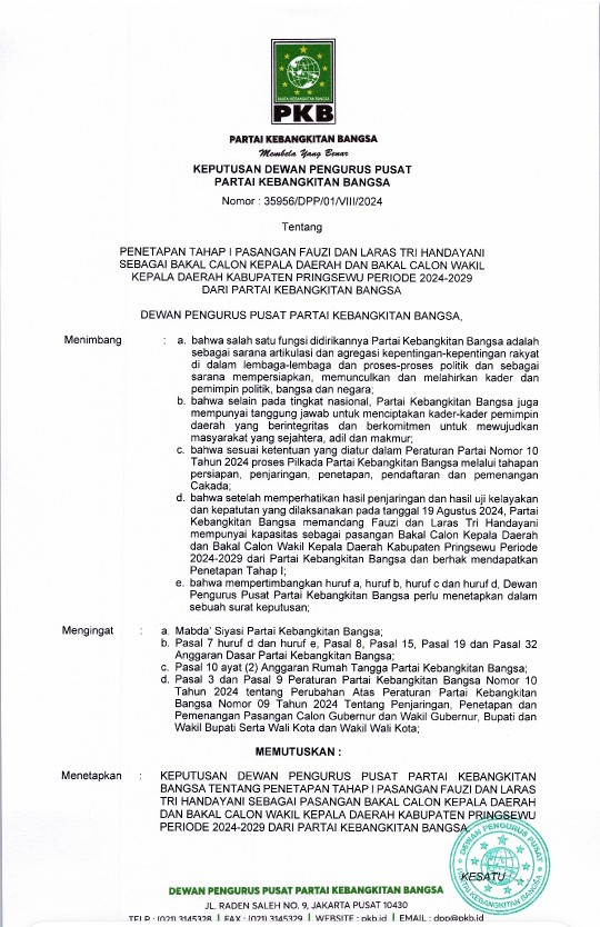 Hal itu berdasarkan Surat Rekomendasi Nomor. 35956/DPP/01/VIII/2024, tentang penetapan Tahap 1 Pasangan Fauzi-Laras Tri Handayani, sebagai Bakal Calon Kepala Daerah dan Bakal Calon Wakil Kepala Daerah Kabupaten Pringsewu Periode 2024-2029 Partai Kebangkitan Bangsa, yang ditandatangani oleh A. Halim Iskandar selaku Ketua Bidang Penguatan Struktur, Eksekutif dan Legislatif dan M Hasanudin Wahid (Sekjen DPP PKB), tertanggal 19 Agustus 2024.