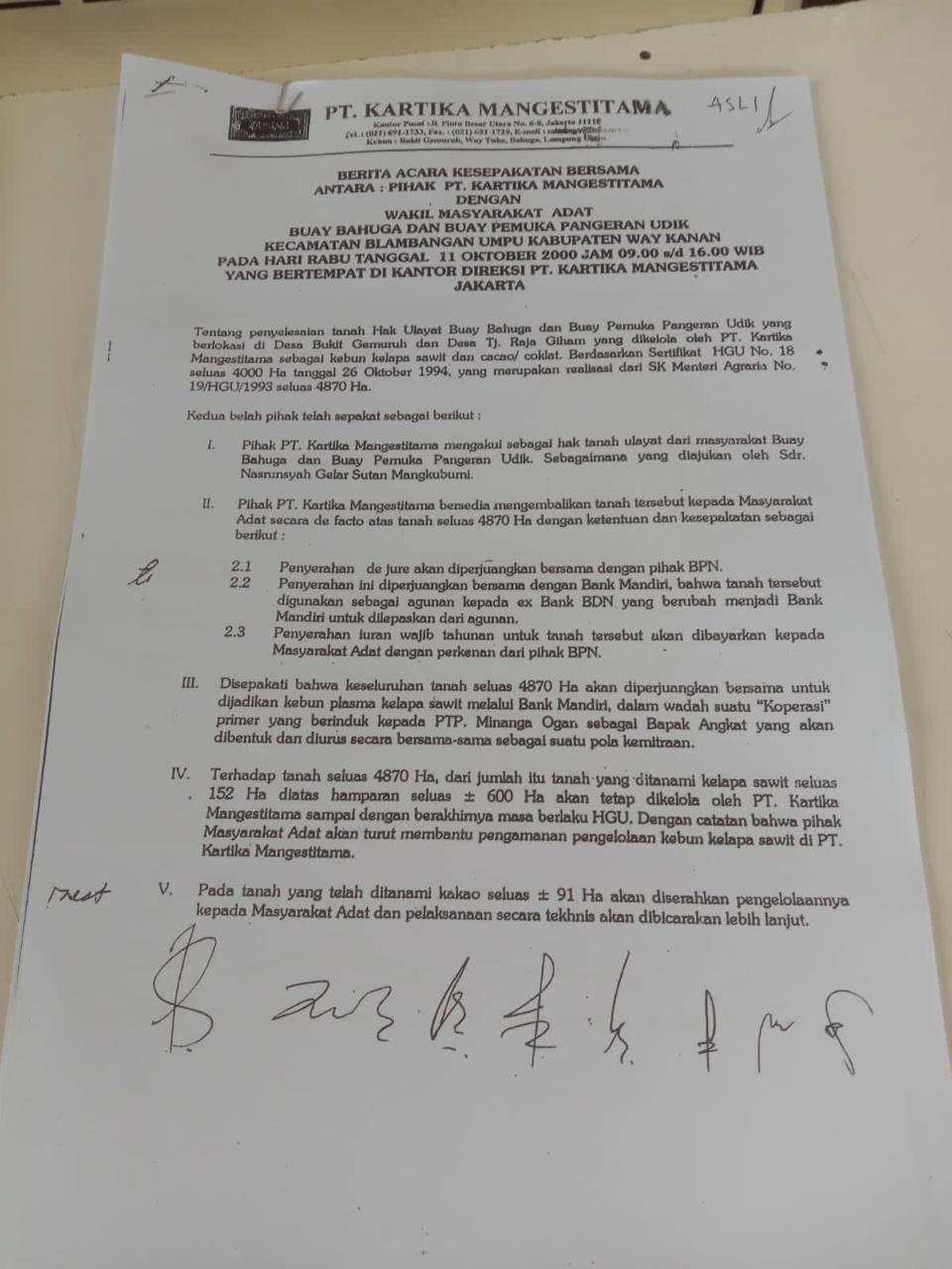 Surat tersebut juga menyebutkan bahwa pada tahun 2000 telah dibuat Berita Acara Kesepakatan Bersama antara masyarakat adat dan pihak perusahaan, yang salah satunya menyatakan bahwa tanah HGU merupakan tanah ulayat masyarakat Buay Pemuka Pangeran Udik dan akan dikembalikan setelah masa pengelolaan berakhir. Namun, hingga kini kesepakatan tersebut belum terealisasi.