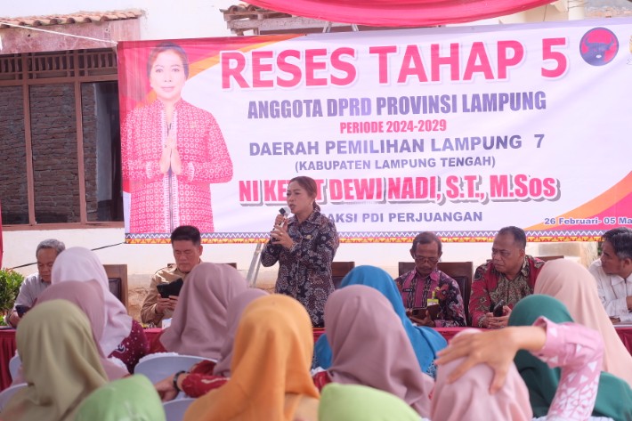 Lampung Tengah (LW): Anggota DPRD Provinsi Lampung Daerah Pemilihan Lampung Tengah, Ni Ketut Dewi Nadi, menggelar reses di Kampung Sidokerto, Kecamatan Bumi Ratu Nuban (27/2). Dalam pertemuan tersebut, warga menyampaikan sembilan poin aspirasi prioritas yang didominasi persoalan infrastruktur jalan rusak berat.