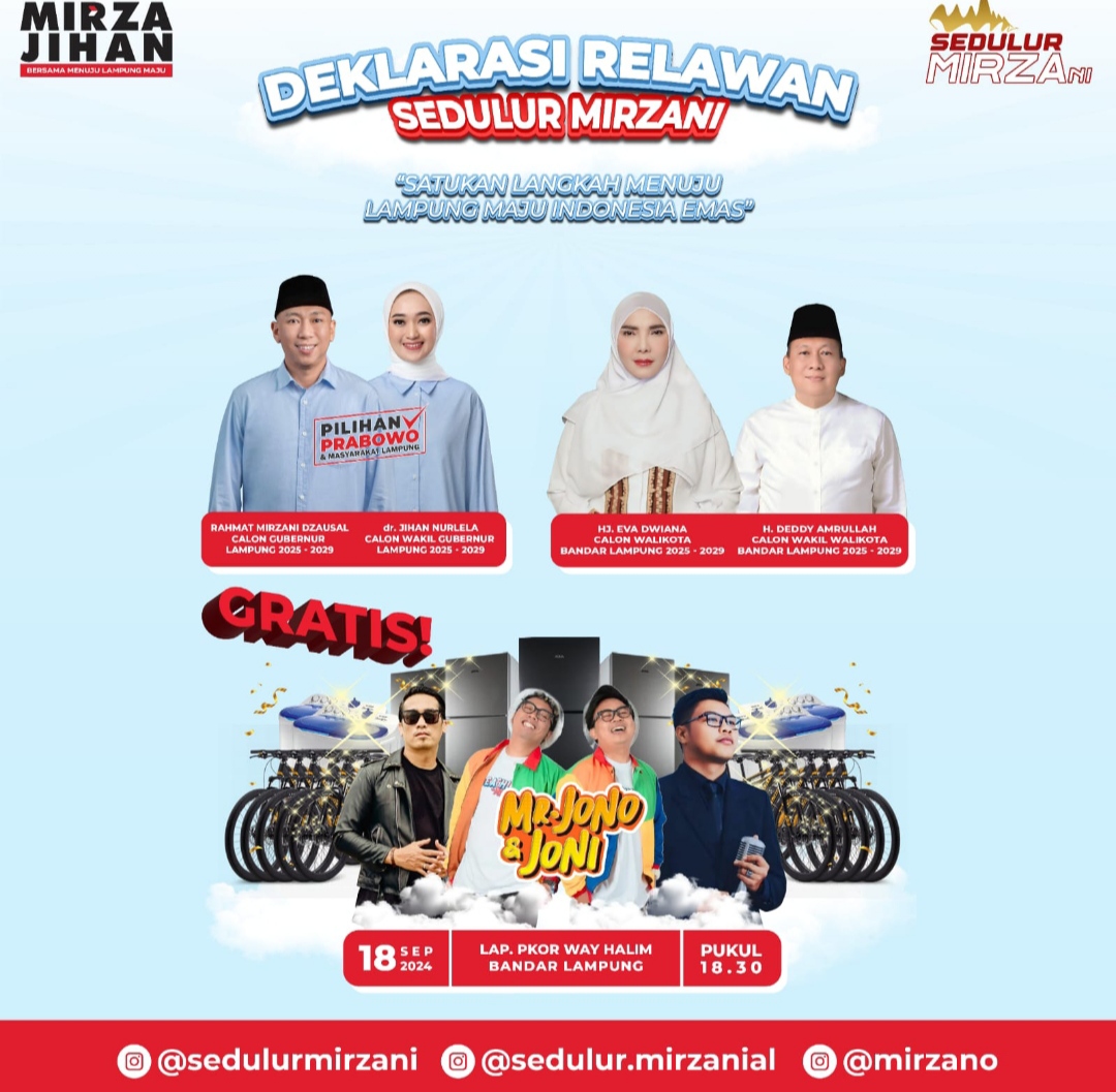 Bandarlampung (LW): Sedulur Mirza yang menjadi rumah besar para organ relawan pendukung Calon Gubernur dan Wakil Gubernur Lampung Rahmat Mirzani Djausal – dr. Jihan Nurlela akan menggelar acara deklarasi dukungan pada Rabu, 18 September 2024 di Lapangan PKOR Way Halim Bandarlampung mulai pukul 18.00 WIB atau usai sholat Magrib.